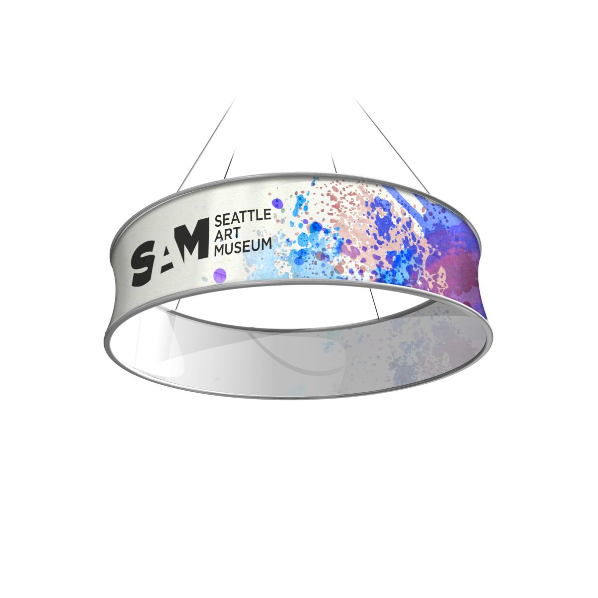 This product allows you to create a spectacular effect during an exhibition in a trade show, a congress or any other event where you want to cause sensation to visitors and customers. Circular in shape only, the suspended structure covered with fabric printed on the front only is available in three sizes.