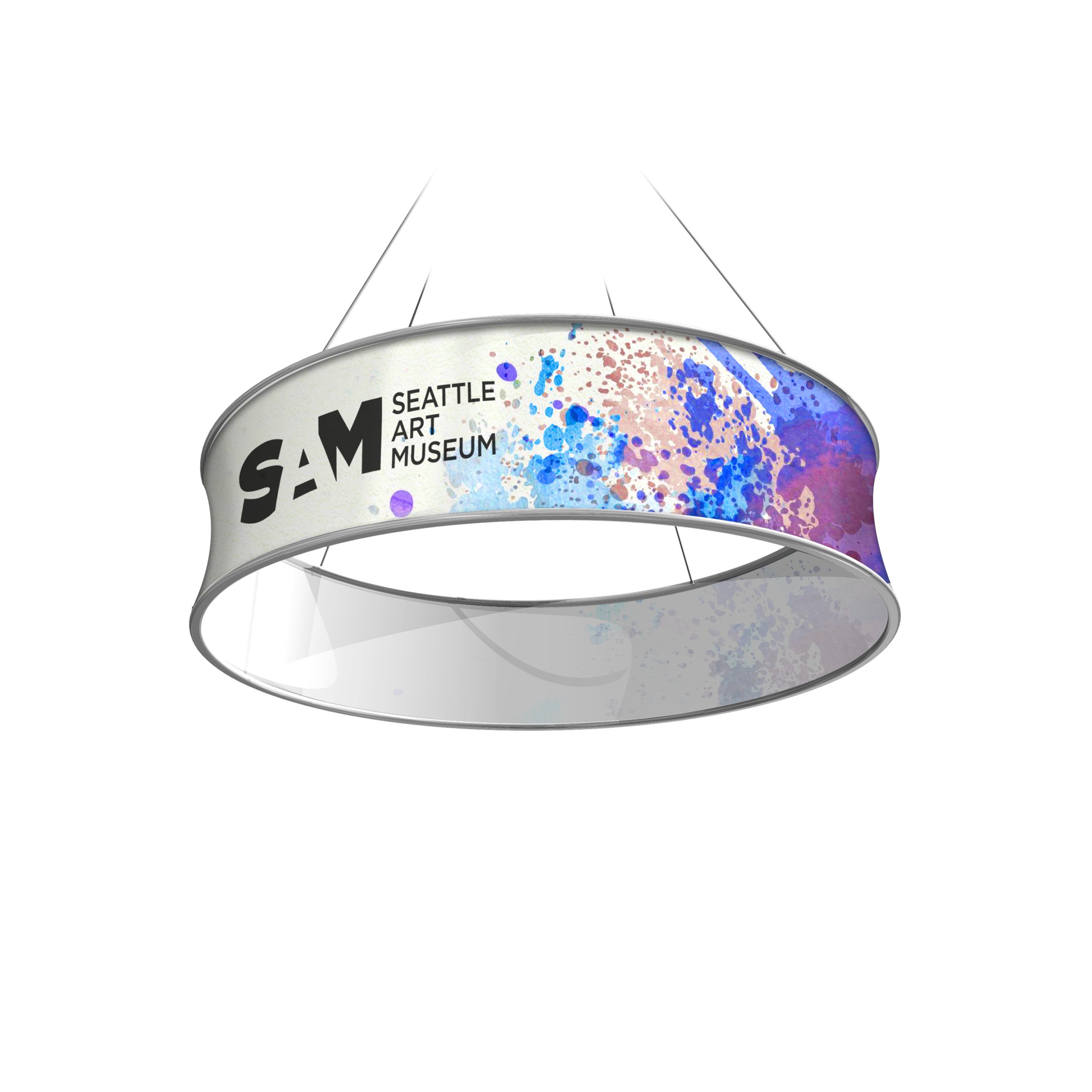 Here is a product that always allows a spectacular effect during an exhibition in a trade show, a congress or any other event where you want to impress your customers. Circular or square in shape, the suspended structure covered with printed fabric will cause a sensation every time.